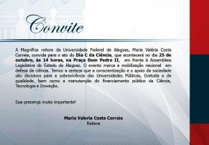 A Magnífica reitora da Universidade Federal de Alagoas, Maria Valéria Costa Correia, convida pesquisadores, bolsistas e colaboradores dos programas PIBIC, PIBID e pós-graduação para o ato do Dia C da Ciência, que acontecerá no dia 25 de outubro, às 14 horas, na Praça Dom Pedro II, em frente à Assembleia Legislativa do Estado de Alagoas.