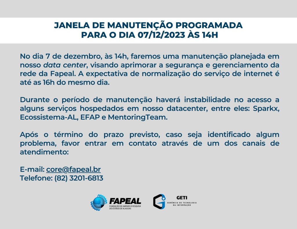 DestaqueNotícias Janela de manutenção programada – 07/12/23 5 de dezembro de 20230 Facebook Twitter LinkedIn Print WhatsApp Janela de manutenção programada Facebook Twitter LinkedIn Print WhatsApp Navegação de Post Previous Article Fapeal participa do Congresso Acadêmico de Iniciação Científica da Ufal Next Article Finep escolhe Alagoas para receber gestores tecnológicos de nove estados do Brasil