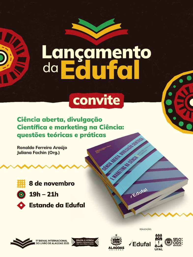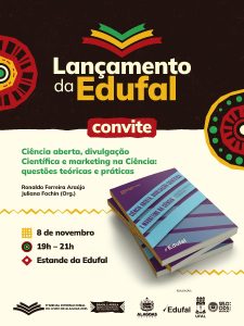 Encerrando a participação da Fapeal na programação acadêmica, no sábado, 08/11, das 19h às 21h, também no estande da Edufal, será lançada a obra “Ciência Aberta, Divulgação Científica e Marketing na Ciência: questões teóricas e práticas”, organizada por Ronaldo Araújo e Juliana Fachin.
