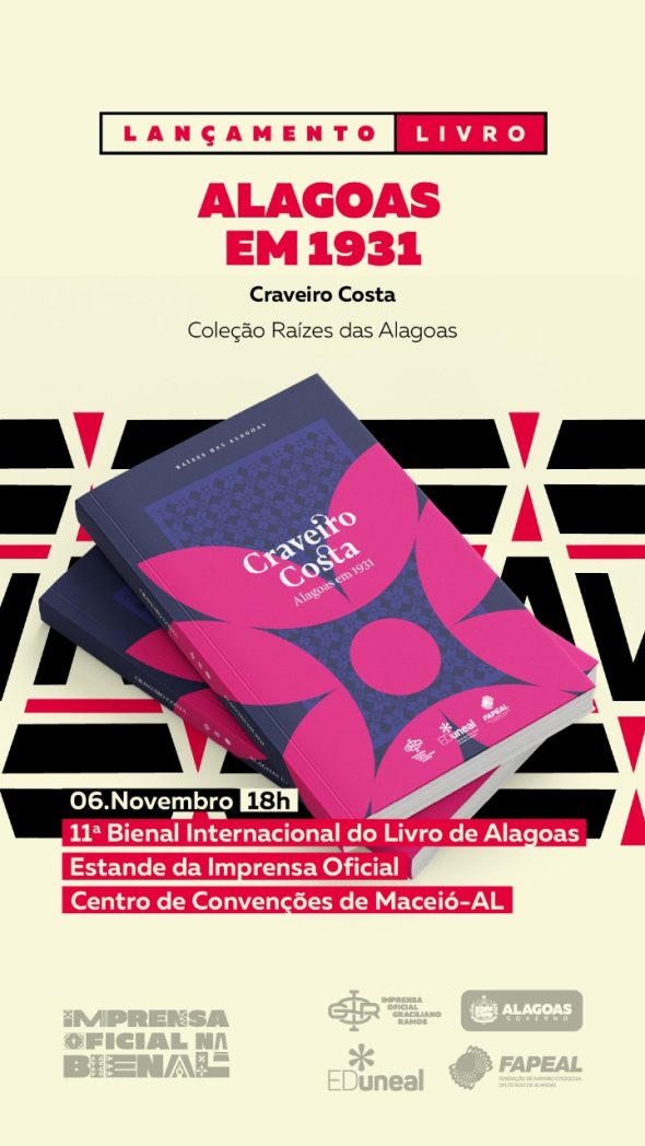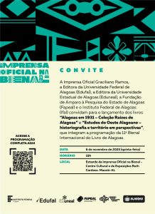 A coleção “Raízes das Alagoas” ganha destaque na programação em 06/11 (quinta), às 18h, no estande da Imprensa Oficial. Na mesma ocasião, também ocorre o lançamento de “Estudos do Oeste Alagoano — historiografia e território em perspectivas”.