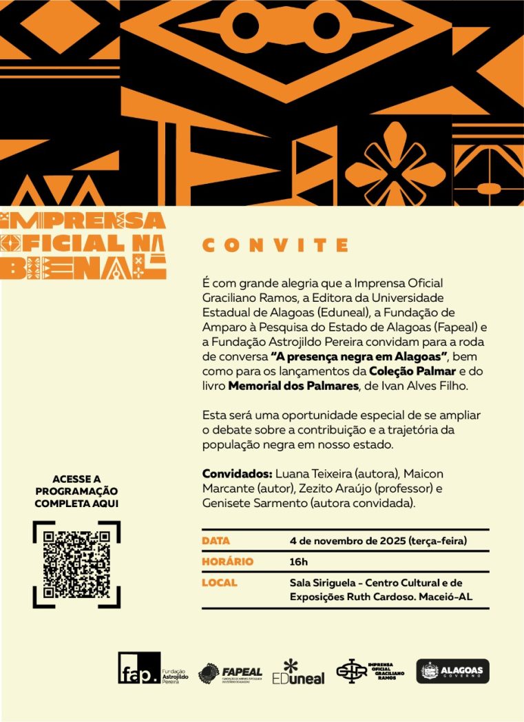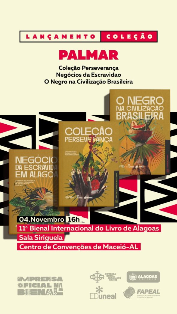O lançamento da coleção “Palmar” será em 04/11 (terça), às 16h, na Sala Siriguela. A Editora da Universidade Estadual de Alagoas (Eduneal) e a Fundação Astrojildo Pereira também convidam para a ocasião.