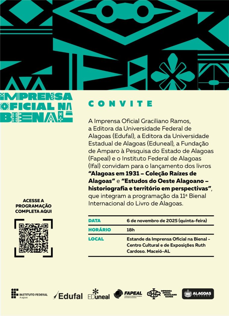 A Imprensa Oficial Graciliano Ramos e a Fundação de Amparo à Pesquisa de Alagoas (Fapeal) anunciam programação conjunta na 11ª Bienal Internacional do Livro de Alagoas. A Bienal vai de 31/10 a 09/11, no Centro de Convenções, no bairro de Jaraguá.